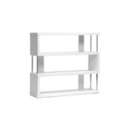 This artsy, modern bookcase gets you organized with style. Our Barnes Bookcase is made of paper veneer over an engineered wood frame and features chromed steel side supports. Not only does this modern display shelf house books, but it is also the perfect place to show off your prized vases, décor, and home accents. The Barnes Bookcase is Malaysian-made, requires assembly, and should be dusted with a dry cloth. Separately offered is the Barnes Bookcase with six shelves as well as the Barnes Bookcase in . 38 inches high x 43 inches wide x 11 inches deep 38″ high x 43″ wide x 11″ deep