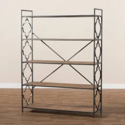Spacious shelving and exquisite quatrefoil accents make the Mirna bookcase a chic addition to any space. A sturdy black iron metal frame supports five large shelfs crafted from MDF wood, ideal for displaying books, pictures frames, and more. Quatrefoil embellishments on the sides of the bookcase add a decorative touch, while a crisscross stretcher on the back of the bookcase provides structural support. The Mirna bookcase is made in China and requires assembly. Dimensions: 65″ High x 48.8″ Wide x 15.7″ Deep; Shelf: 13.8″ High x 47.2″ Wide x 15.7″ Deep; Legs: 3.1″ High