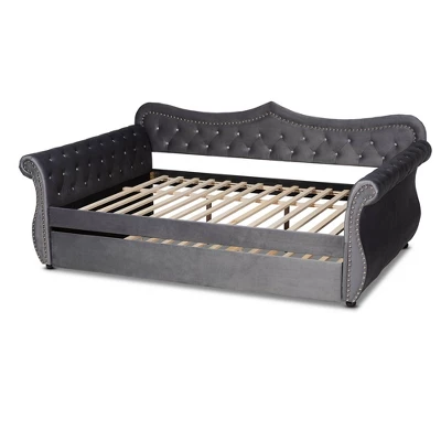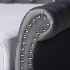 Lounge and sleep in glamorous style with the Abbie daybed. This versatile piece is made in Malaysia and fitted with a pull-out trundle to provide convenient accommodation for overnight guests. Its sturdy wooden frame is padded in foam and upholstered in a soft, sumptuous velvet fabric that provides ample comfort for resting. The Abbie daybed requires assembly and brings a classy touch to the modern bedroom or guest room. Crystal tufting adds charm, while silver metal nailheads accentuate the sweeping curves that define the elegant silhouette. Dimensions: 41.73″ High x 93.7″ Wide x 57.87″ Deep; Arms: 32.28″ High; Trundle: 76.77″ Wide x 40.94″ Deep x 11.42″ High; Trundle Maximum Mattress Height: 7.87″ High; Inside Dimensions (Mattress Size): 54″ Wide x 74″ Deep