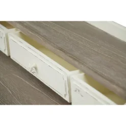 Boasting a streaked and distressed finish plus plenty of storage space via four drawers and a well-positioned shelf, our Anjou Traditional French Accent Writing Desk combines flair and utility. The genuine mindi-wood tops feature a streaked natural veneer that pairs perfectly with the distressed finishing that comprises the remainder of this writing desk. The wooden drawer handles maintain the stylistic stance to perfection. Dimensions: 37.8″ High x 39.25″ Wide x 19.6″ Deep; Upper left drawer: 2.5″ High x 8.8″ Wide x 5″ Deep; Upper middle drawer: 2.5″ High x 14.8″ Wide x 5″ Deep; Upper right drawer: 2.5″ High x 8.8″ Wide x 5″ Deep; Lower level drawer: 2.2″ High x 27.5″ Wide x 12.8″ Deep