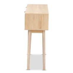 Add a retro inspired accent to your entryway with the stunning Baird console table. Made in China, the Baird is comprised of sturdy wood showcasing a light oak brown finish. Two drawers provide space to store keys and mail, while the wide tabletop offers room to display plants and decor. Requiring assembly, the console features woven rattan drawer faces and gold tone metal handles for eye catching style. A handy piece brimming with personality, the Baird console is sure to enhance any space.