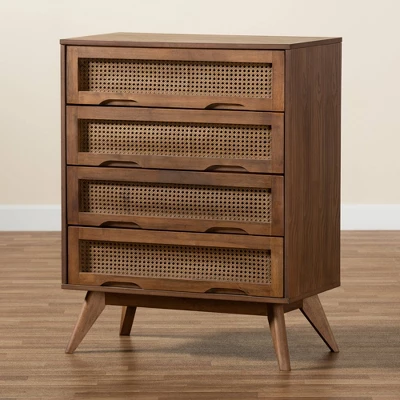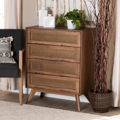Take advantage of your bedroom space with the fantastic utility and classic design of the Barrett chest. Made in Malaysia, this walnut brown finished wood chest brings warmth to any space. Four large drawers offer plentiful storage space to declutter busy rooms and organize clothes, linens, and more. Requiring assembly, the Barrett features woven synthetic rattan drawer faces that exude retro charm. Angled legs create an expressive silhouette, making the Barrett chest a versatile upgrade to any bedroom.