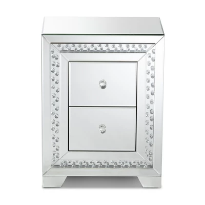 Add a touch of glamour to your interior with the Mina end table. The Mina is constructed from solid MDF wood and beveled mirrored glass. Three drawers provide ample space to store remotes, books, and other household essentials. The end table showcases two panels overlaid with crystal beads, which magnificently reflect the light within the room. Crystal drawer knobs add a decorative touch and provide easy access to the drawers. The Mina end table is made in China and will arrive fully assembled. Dimensions: 24.02″ High x 18.11″ Wide x 13.15″ Deep; Drawer: 10.4″ High x 12″ Wide x 7.1″ Deep; Legs: 1.77″ High