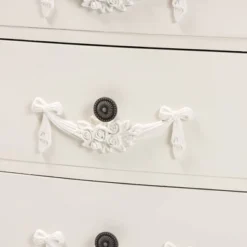 Bring graceful organization to your interior with the fantastic design of the Callen end table. Made in China, this handy piece is constructed from sturdy wood. Three drawers provide ample storage space for a variety of household essentials and reserve the tabletop for daily use. The Callen will arrive fully assembled and is adorned with floral moldings for an elegant display that is sure to stand out. Metal drawer knobs add a minimalist touch, making the Callen end table a resourceful yet stylish addition to any space. Overall Dimensions: 27.50″ High x 18.90″ Wide x 13.70″ Deep; Drawer(Each): 13.70″ Wide x 11.40″ Deep x 5.50″ High; Legs: 7.50″ High;