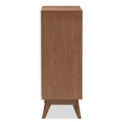 Exude mid-century Scandinavian style in your home with Calypso two-tone two-door shoe cabinet with drawer. Showcasing a sleek and simple design with functionality in mind, the Calypso is constructed of engineered wood in walnut and finishing for lasting good look. Featuring drawer with cut-out handle, contrasting with the walnut wood panels inlaid, the Calypso exudes laid-back luxury and casts a Scandinavian aesthetic over your space. Angular legs complete mid-century look. Pull-out drawer open to reveal ample storage for hats, socks, scarfs, purse and wallets. Made in Malaysia, the Calypso two-door shoe cabinet requires assembly. Dimensions: 42.09″ High x 31.5″ Wide x 15.75″ Deep; Drawers: 3.54″ High x 28″ Wide x 13.18″ Deep; Upper Shelf: 5.43″ High x 30.23″ Wide x 11.8″ Deep; Middle&Lower Shelves: 5.7″ High x 30.23″ Wide x 11.8″ Deep; Legs: 7.68″ High