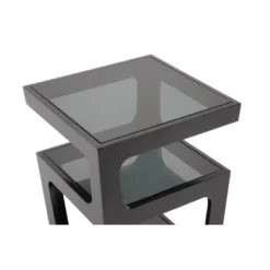 A unique contemporary side table option, this designer piece offers triple tinted tempered glass surfaces for sophisticated storage and display. The engineered wood frame descends from the top surface to the bottom in two opposite corners for each level, leaving each space with a wider gap for easy access. The design includes a width that tapers as it descends from top to bottom. The Clara End Table is fully assembled: just position the glass in place. Maintain the table’s beauty by simply wiping the glass surfaces with a glass cleaning solvent and a soft cloth; the frame should be dusted with a dry cloth. Product dimension:17″W x 17″D x 21.875″H Product dimension:17″W x 17″D x 21.875″H
