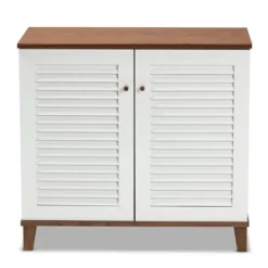 Store your shoes on the sly with the Coolidge shoe cabinet. Two slatted doors, fitted with round knobs, conceal four shelves with storage space for up to 12 pairs of shoes. Tapered legs add refined style and provide elevation to deter dust buildup. Constructed from engineered wood, the Coolidge showcases a cool two-tone white and walnut brown finish that complements any color scheme. The Coolidge shoe cabinet is made in Malaysia and requires assembly. Dimensions: 27.99″ high x 29.53″ wide x 14.49″ deep; Shelf: 5.5″ high x 27.99″ wide x 11.57″ deep; Legs: 3.54″ high;