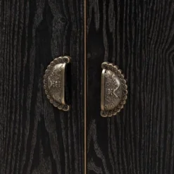 Add stylish storage to any space with the fantastic Denali cabinet. Made in China, the Denali is comprised of a sturdy wood frame showcasing a unique two-tone black and walnut brown finish. Two doors open to reveal a spacious storage compartment capable of organizing a large variety of items, while the rectangular tabletop serves as a chic pedestal for decorations. Requiring assembly, the Denali is accented with striking antique brass finished metal handles for added personality. Black finished metal hairpin legs lend a retro mid-century touch. A distinctive piece with handy utility, the Denali cabinet elevates the modern home. Dimensions: 29.9″ High x 41.7″ Wide x 15.7″ Deep; Shelf: 15.4″ High x 39″ Wide x 15.4″ Deep; Legs: 11.8″High;