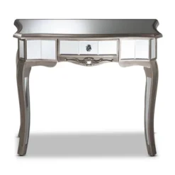 Bring lustrous appeal to the interior of your home with the dazzling design of the Elgin console table. Made in China, this table is comprised of a brushed silver finished wood frame decorated with mirrored glass accents that beautifully reflect light. One large drawer provides convenient storage space for keys and mail, while its broad tabletop creates a stunning display for decorative items. Requiring assembly, the Elgin is adorned with a faux crystal drawer knob for an added touch of glamour. Elegant molding further distinguishes the Elgin console table as a luxurious yet practical addition to any space.