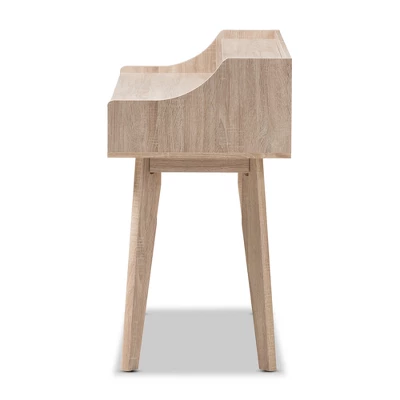A perfect blend of classic and modernity, the Fella collection showcases pattern played with clever balance of colors and sleek surface. Constructed of engineered wood in oak and gray two-tone finishing, the Fella 4-drawer study desk reveals a fresh and relaxing look. Angled legs complements the piece of furniture for superior support and style. Four drawers open to reveal storage room for stationery and the two open shelves make room for books and magazines. Elevated rims allow the use of the top surface as display space for your décor. With practicality, the drawers with cut-out handles in gray wood finish contrast with the oak surface for a contemporary, Scandinavian aesthetic in your home. Made in Malaysia, the Fella 4-drawer study desk requires assembly.