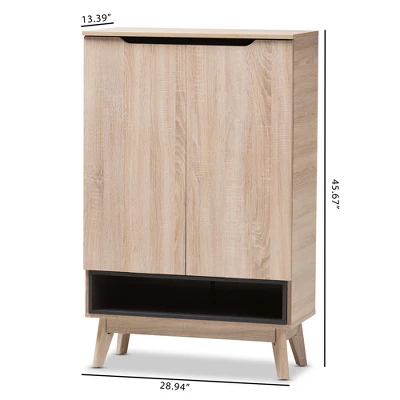 A perfect blend of classic and modernity, the Fella collection showcases pattern played with clever balance of colors and sleek surface. Constructed of engineered wood in oak and two-tone finishing, the Fella 5-drawer chest reveals a fresh and relaxing look. Angled legs complements the piece of furniture for superior support and style. Two doors open to reveal storage room for shoes. With practicality, the inset handles and the open shelves in wood finish contrasts with the oak surface for a contemporary, Scandinavian aesthetic in your home. Made in Malaysia, the Fella 2-door shoes storage cabinet requires assembly. Dimensions: 45.67″ High x 28.94″ Wide x 13.39″ Deep; Upper Closed Shelf: 7.44″ High x 27.68″ Wide x 12.2″ Deep; Middle Closed Shelves: 5.28″ High x 27.68″ Wide x 12.2″ Deep; Lower Closed Shelf: 5.87″ High x 27.68″ Wide x 12.2″ Deep; Open Shelf: 4.92″ High x 26.73″ Wide x 12.2″ Deep; Legs: 6.89″ High