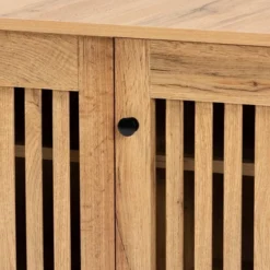 Featuring a modern design with ample storage space, the Fernanda shoe cabinet upgrades any entryway. Made in Malaysia, this cabinet is crafted from oak brown finished wood that adds visual warmth to any interior layout. Three doors conceal six shelves with storage space for up to 12 pairs of shoes, depending on size. Requiring assembly, the Fernanda features slatted doors to enable air circulation and prevent mold growth on your shoes. Tapered legs provide a convenient height, making the Fernanda shoe cabinet a stylish and practical solution to entryway storage. Dimensions: 26.3″ High x 44.88″ Wide x 13.23″ Deep; Left Shelves: 6.9″ High x 28.03″ Wide x 9.25″ Deep; Right Shelves: 6.9″ High x 14″ Wide x 9.25″ Deep; Legs: 3.74″ High