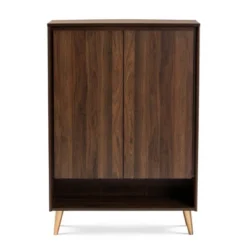 A beautiful blend of classic style and modern practicality, the Landen shoe cabinet elevates any home. Made in Malaysia, the Landen is comprised of a sturdy wood frame finished in a warm walnut brown. Four shelves, located behind two doors, and one open shelf provide space to store 15 pairs of shoes. Requiring assembly, the cabinet is fitted with splayed gold tone legs for a charming retro look. Fantastic utility, along with a unique and eye-catching aesthetic, distinguish the Landen shoe cabinet as an exceptional addition to any entryway.