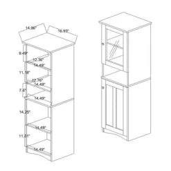 - Oveall Dimensions: 62.40″ High x 16.93″ Wide x 14.96″ Deep; Top shelf behind glass door: 9.49″ High x 14.49″ Wide x 12.36″ Deep; Bottom shelf behind glass door: 11.18″ High x 14.49″ Wdie x 12.76″ Deep; Open shelf: 7.60″ High x 14.49″ Wide x 12.76″ Deep; Top shelf behind lower door: 14.25″ High x 14.49″ Wide x 12.76″ Deep; Bottom shelf behind lower door: 11.81″ Highx 14.49″ Wide x 12.76″ Deep;