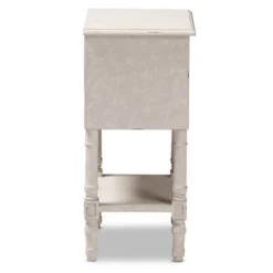 The Lenore 2-drawer nightstand will add an element of romance to your bedside with its ornate ball-turned details and refreshing whitewashed finish. The country cottage and farmhouse-inspired design is evident in the amount of detail put into this nightstand. The Lenore features two pull-out drawers and one bottom shelf for convenience. Charming, bronze finished drawer pulls give the nightstand a bit of antique style. The Noemie is easy to coordinate with a wide range of styles, including French, rustic, farmhouse, and provincial-inspired decor. Add the Lenore to your guest room to devisitors, or keep it for yourself in your own bedroom. Made in Indonesia, the nightstand requires assembly. Dimensions: 25.59″ High x 15.75″ Wide x 11.81″ Deep; Drawer: 3.94″ High x 10.43″ Wide x 9.84″ Deep; Shelf: 8.46″ High x 14.57″ Wide x 11.02″ Deep; Legs: 5.71″ High