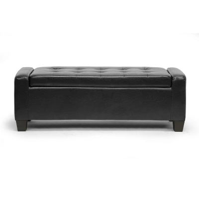 An open-and-shut case of budget-minded bliss, our Manchester Ottoman unites stately charisma with utilitarian attention to storage space. This contemporary tufted ottoman features black bonded leather with a genuine eucalyptus wood frame. The cushioned top provides added seating or a comfortable footrest. Soft corners contrast against angular wedge feet.