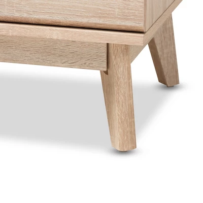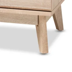 The simplicity and minimalist look of the Miren 5-drawer chest make it a seamless addition to your bedroom or guest room. The sleek silhouette and angled, tapered legs of the chest are hallmarks of its mid-century modern-inspired design. The Miren features an engineered wood frame finished in a oak , with finishing between the drawers for a subtly contrasting color scheme. The chest’s five drawers pull forward from the top on sliders. The Miren’s simple-yet-chic look make it easy to coordinate with your existing decor. The under clearance area beneath the chest make it easier to clean underneath it. Made in Malaysia, the Miren requires assembly. Dimensions: 50.2″ High x 31.1″ Wide x 16.7″ Deep; Drawers: 7.6″ High x 29″ Wide x 13.4″ Deep; Legs: 9.5″ High