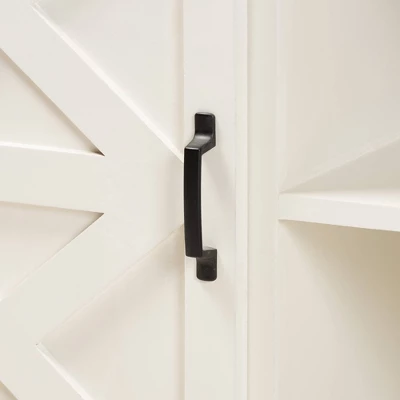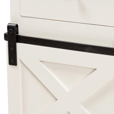 Transform your dining room with the chic farmhouse design of the Nadia sideboard buffet. Made in China, this sideboard is constructed from sturdy wood with metal accents. Two drawers provide space for kitchen utensils, while four shelves behind the sliding barn door support larger cookware and appliances. Requiring assembly, the Nadia with a sleek metal handle and drawer knobs for a contemporary touch. With a stylish take on classic design, the Nadia sideboard buffet adds excellent utility to any dining space. Overall Dimensions: 31.50″ high x 31.50″ wide x 14.20″ deep; Large Drawer: 13.20″ Wide x13.00″Deep x 11.80″ High;