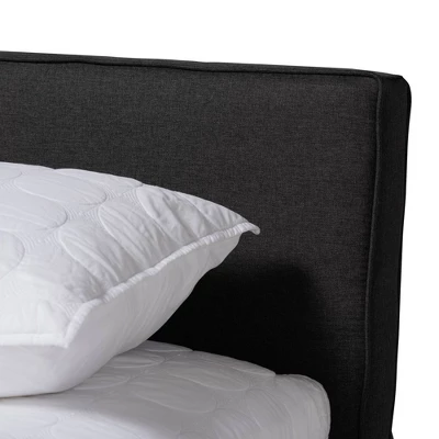Featuring ample storage space, the Rikke bed is a convenient addition to any bedroom. Two large drawers at the foot board provide extensive space to store extra blankets, linens, and more. Long vertical drawer handles add a sleek touch. Designed with both function and comfort in mind, the Rikke features a gray fabric upholstered headboard with plush foam padding. A two-tone gray and walnut brown finish on the base complements the gray headboard and gives the Rikke a cool, contemporary feel. This platform bed features a strong particleboard base that provides mattress support and eliminates the need for a box spring. Pair this stylish bed with the other bedroom pieces in the Rikke collection to complete the look. The Rikke bed is made in Malaysia and requires assembly. Dimensions: 31.5″ High x 63.5″ Wide x 88″ Deep; Headboard: 21.9″ Wide x 30.5″ Long x 5.1″ Thick; Side rail: 9.4″ Wide x 87.4″ Long x 0.6″ Thick; Foot board: 15.7″ Wide x 63.6″ Long x 0.6″ Thick; Slats: 28.7″ Wide x 30.5″ Long x 0.6″ Thick; Top of Slat: 9.4″ High; Legs: 0.2″ High; Storage: 9″ High x 31″ Wide x 28″ Deep; Inside Dimensions (Mattress Size): 54″ Wide x 74″ Deep