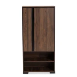 Accommodate the needs of your home with the remarkable Raina shoe cabinet. Made in Malaysia, this cabinet is constructed from sturdy wood. Two open shelves and four enclosed shelves behind the doors provide space for about a dozen pairs of shoes, depending on size. Requiring assembly, the Raina features round cut-outs in its back to enable air circulation and disperse odors. Exuding contemporary charm, the Raina shoe cabinet is a stylish solution to your storage needs.