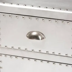 Bring chic industrial style into your space with the Serge cabinet. Constructed from wood and metal, the Serge features one drawer and one concealed compartment, behind a door, to keep items organized and out of sight. Polished silver metal drawer handles add a sleek touch. Inspired by vintage storage trunks, the Serge is embellished with rivets and corner protectors. Use this piece as a nightstand in the bedroom or as an accent piece in the living room. The Serge cabinet is made in China and will arrive fully assembled. Dimensions: 28.35″ High x 16.34″ Wide x 13.98″ Deep; Drawer: 11.81″ High x 11.02″ Wide x 4.92″ Deep; Inner Shelf: 19.09″ High x 15.16″ Wide x 12.8″ Deep;