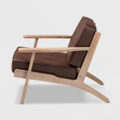 Create a cozy, retro reading alcove in your living space with the Sigrid armchair. Featuring a low profile and wide, angular frame, the Sigrid displays all the hallmarks of mid-century design. The seat and back are upholstered in a sleek dark brown faux leather effect fabric that complements the antique oak finish on the solid rubberwood frame. Its thick, foam-padded cushions provide comfort for years to come. Striking from any angle, the Sigrid is well suited for both private residences and public office spaces. The Sigrid armchair is made in Malaysia and requires assembly. Dimensions: 29.13″ high x 29.33″ wide x 36.02″ deep; Seating dimensions: 22.83″ wide x 21.65″ deep x 16.34″ high (from Floor); Arm height: 21.06″ high; Back: 15.35″ high; Legs: 10.63″ high;