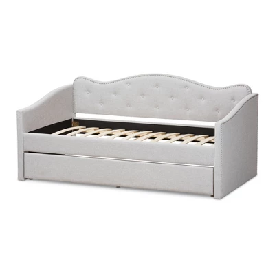 A timeless style with graceful curve and button tufted design, the Kaija fabric upholstered daybed is perfect for use in the home where space may be a little restricted; an elegant addition to any interior. Constructed of solid rubberwood and plywood, the Kaija is foam padded and upholstered throughout for your ultimate comfort. Featuring sloping side panels with matching curvy back panels, the Kaija showcases the details of an updated piece of modern furniture. Floating back buttons and silver nail heads trim complete the design elegantly. 3-In-1 Kaija daybed comes with a twin roll-out trundle, so it can accommodate up to two overnight guests. It’s a sofa! It’s a bed! It’s another bed! Made in Malaysia, the Kaija requires assembly.