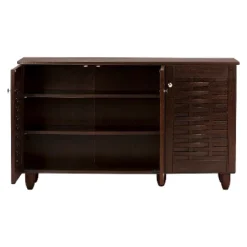Neatly store your shoes in an organized manner with theses Winda shoe cabinets. The shoe rack has ample shelving space to store your footwear while the doors keep the shoes out of sight for a piece of mind. These shoe cabinets are made of engineered wood, a range of derivative wood products which are manufactured by binding or fixing the strands, particles, fibers, or veneers or boards of wood, together with adhesives, or other methods of fixation to form composite materials., which is known for its practicality of everyday use. The wooden shoe cabinets’ design and finish give these cabinets a grand and classic look to hold your entryway essentials and clusters. Made in Malaysia, the shoe cabinet requires assembly. Dimensions: 26.33″ High x 44.46″ Wide x 13.1″ Deep; Shelf/Drawer1: 6.42″ High x 28.03″ Wide x 9.25″ Deep; Shelf/Drawer2: 6.93″ High x 28.03″ Wide x 9.25″ Deep; Shelf/Drawer3: 7.17″ High x 28.03″ Wide x 11.73″ Deep; Shelf/Drawer4: 6.42″ High x 14.02″ Wide x 9.25″ Deep; Shelf/Drawer6: ” High x ” Wide x ” Deep; Shelf/Drawer6: 7.17″ High x 14.02″ Wide x 9.25″ Deep;